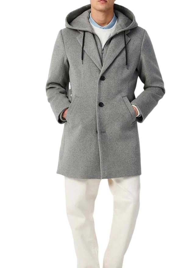 ZA Fashion Cloud Men's Single Breasted Urban Casual Wool Blend Warm with Removable Hood Long Chic Style Grey Slim Fit Coat