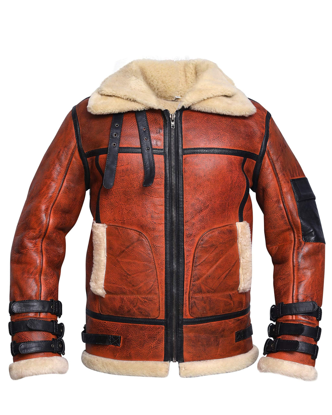 ZA Fashion Cloud Men's B3 Genuine Leather Ginger Brown Aviator Coat Real Shearling Bomber Pilot Style Fur Jacket