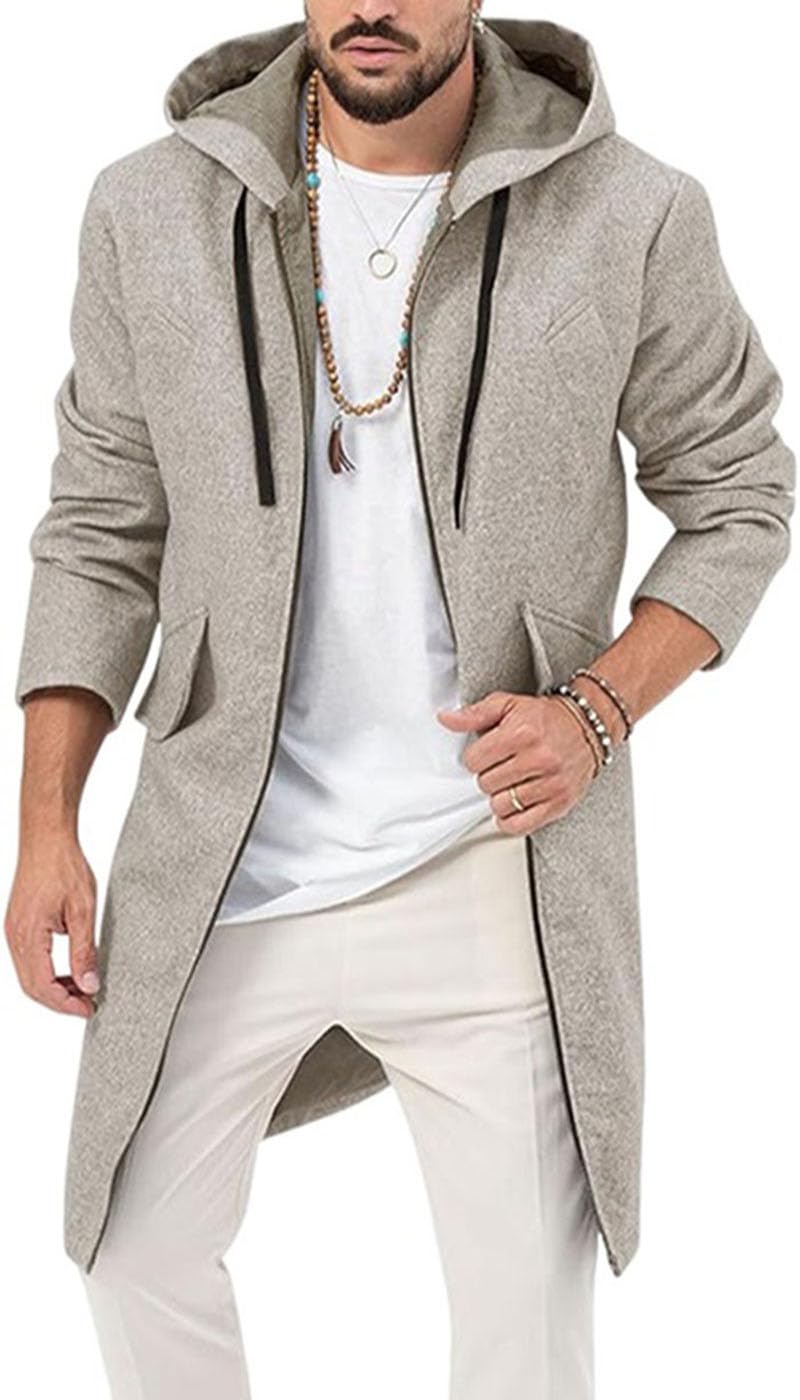 ZA Fashion Cloud Men's Trench Coat Wool Blend Jacket Full Zip Winter Classic Business Soft Warm Hoodie Long Grey Overcoat